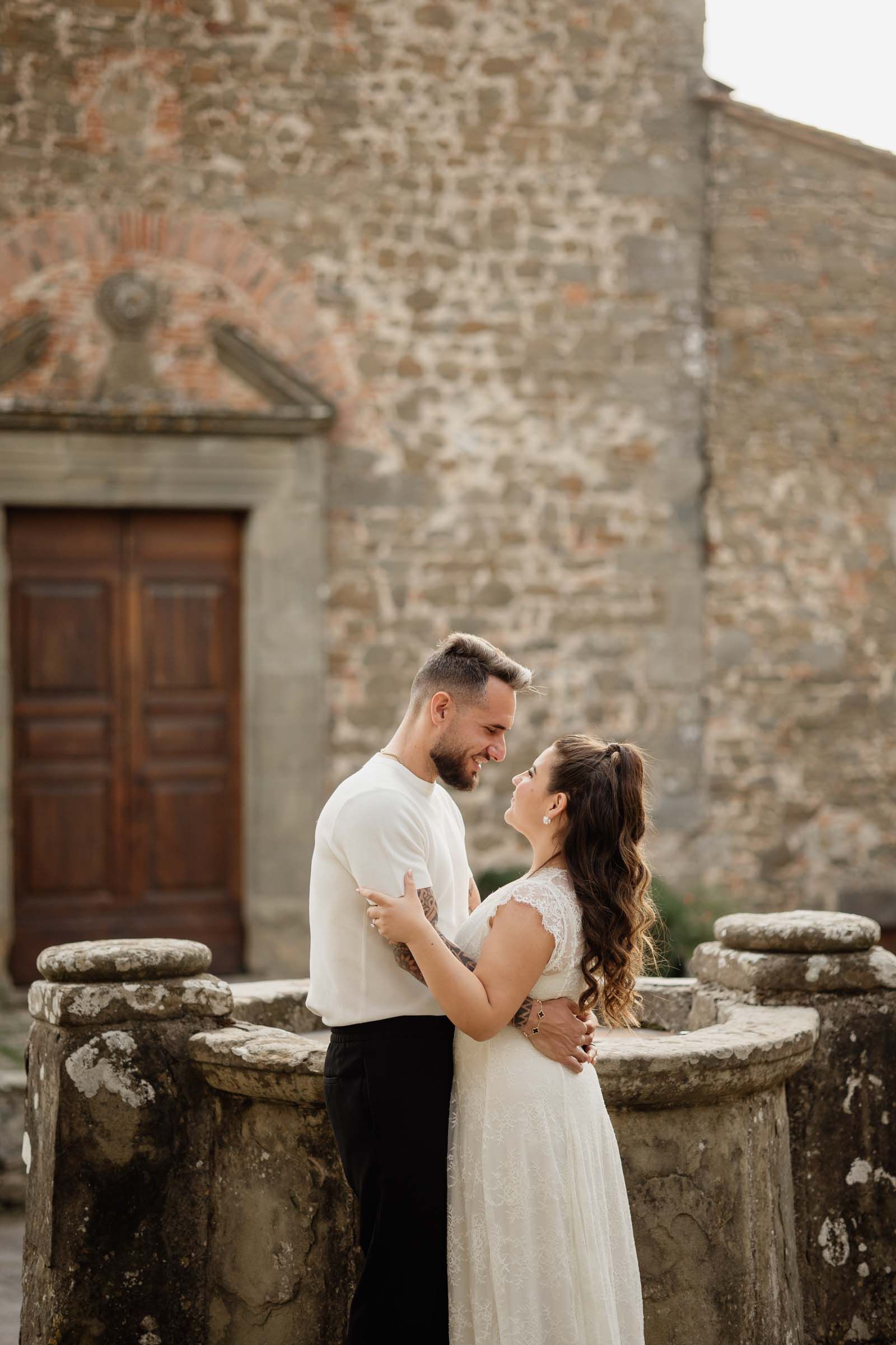 No guest list, no tension – just the two of them hitting the road for their elopement in Chianti. We started the afternoon wandering through the stone streets of a medieval village, catching the breeze and soaking up that ancient Italian energy before heading out into the hills.